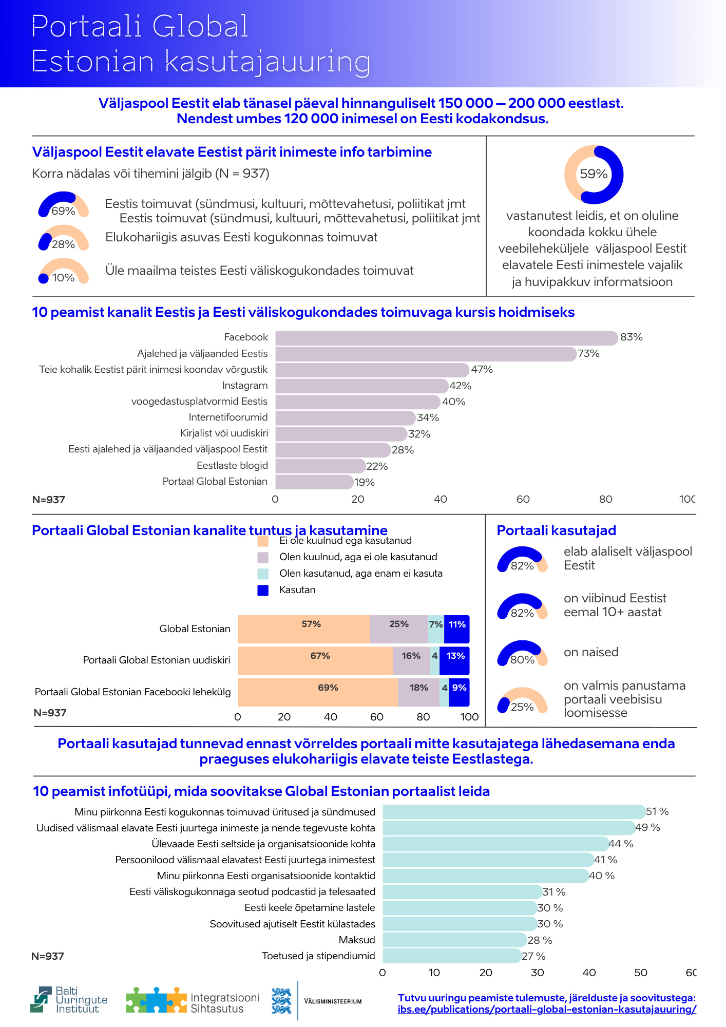 Alt poolt leitavast infolehelt saad uudistada, millist infot üleilmsed eestlased tarbivad ning millisel kohal on infoallikana nende jaoks portaal Globarl Estonian. 2023. aasta sügisel läbiviidud lühiuuringu eesmärgiks oli paremini mõista väljaspool Eestit elavate Eestist pärit inimeste infovajadust ning koguda mõtteid ja ettepanekuid portaalile Global Estonian ja sellega seotud Facebooki leheküljele ja uudiskirjale.